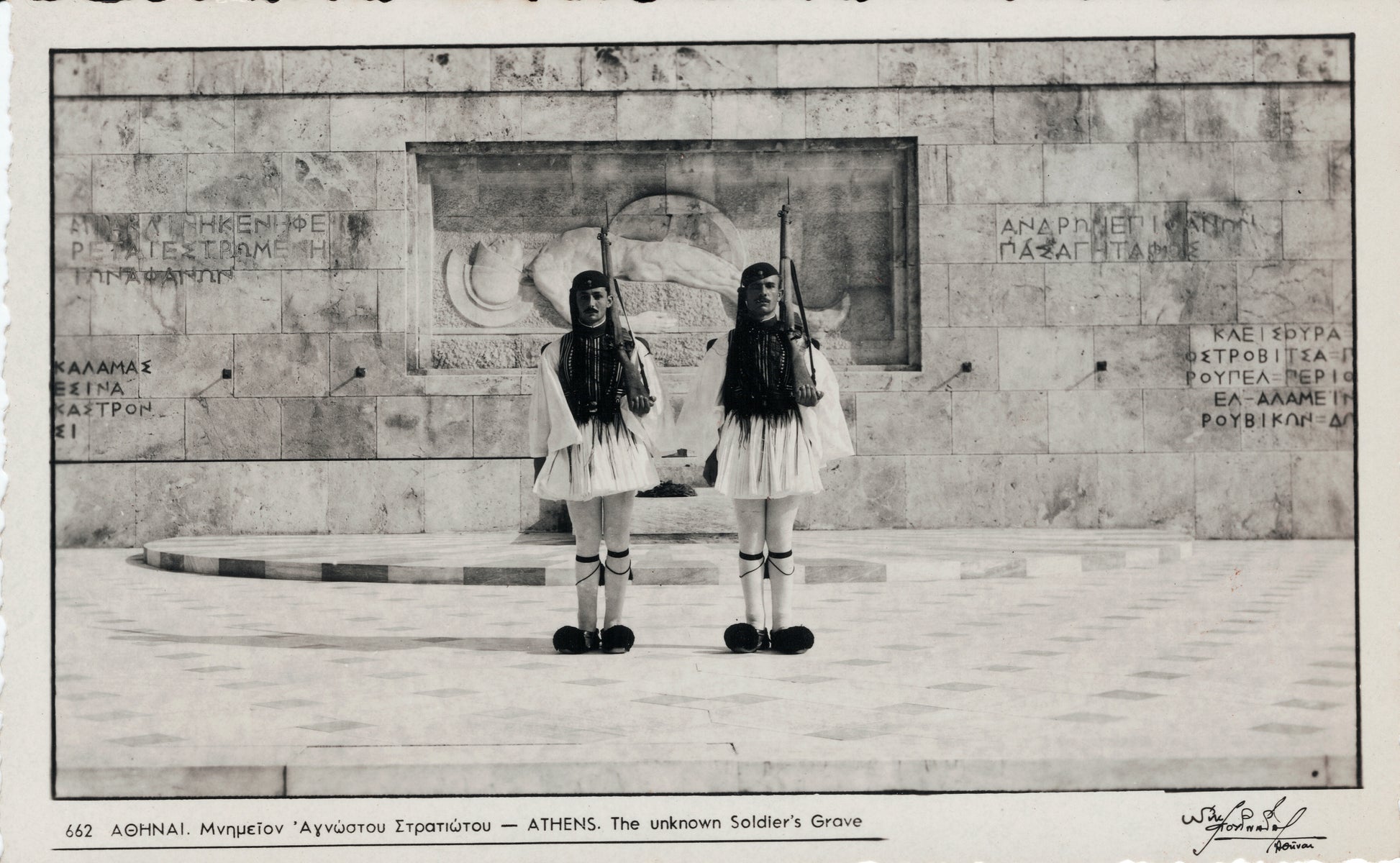 A crisp, 1950s, black-and-white rendering of the Tomb of the Unknown Soldier in Athens, Greece, guarded by the Evzones. From a sailor's scrapbook, the back contains some remnants from the scrapbook's page - not affecting the imagery of the front.
