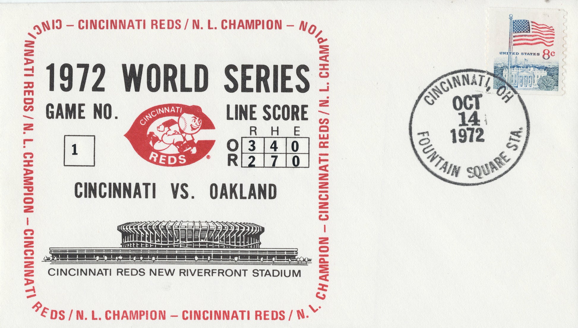 Commemorating Game 1 of the 1972 World Series, in which Oakland triumphed over the Reds, postmarked in Cincinnati, Ohio.