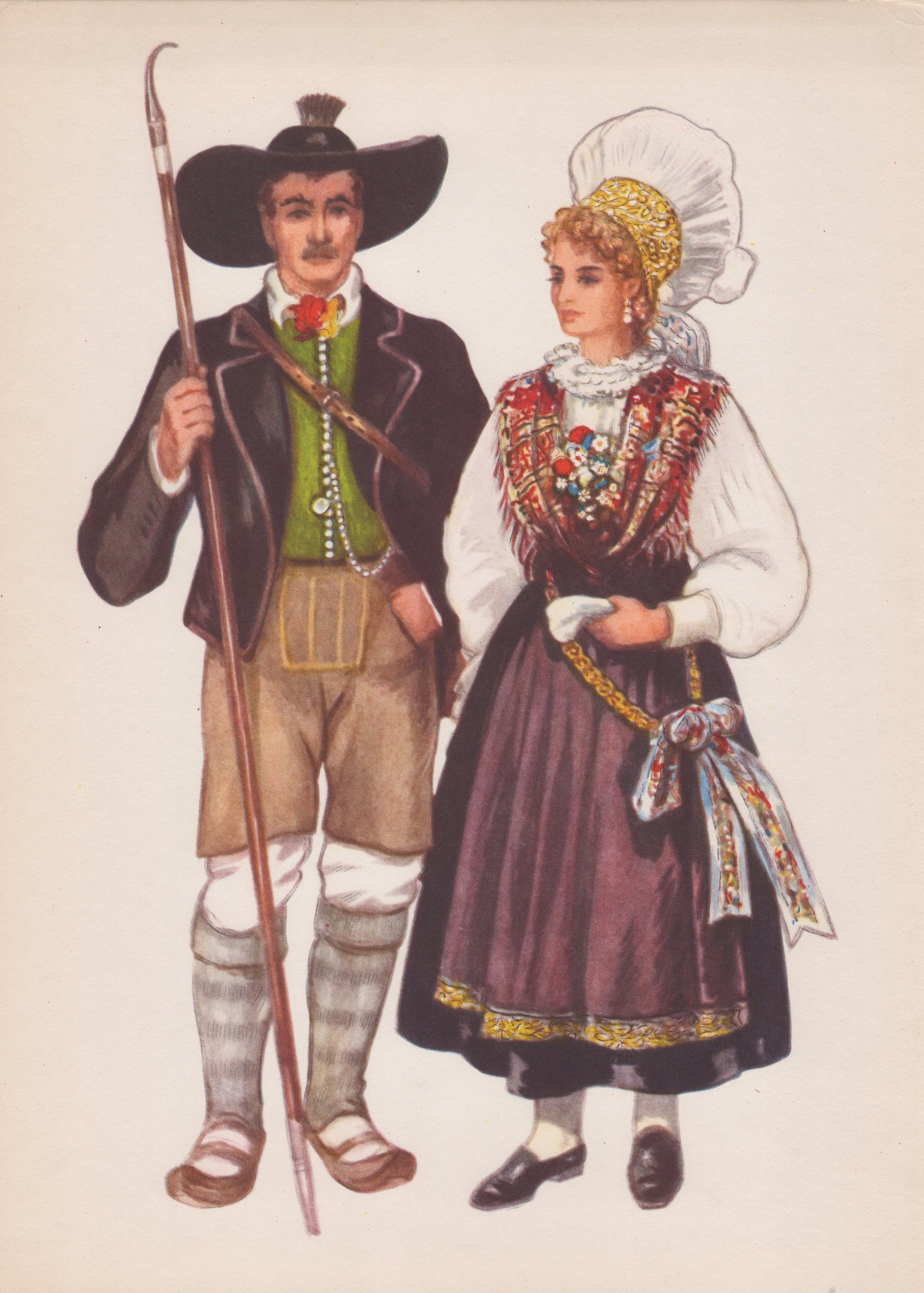 From Vladimir Kirin's National Costumes and Dances of Yugoslavia series, the traditional dress of Bled. A beautifully colored print on thicker paper, the page measures 8 1/2" wide x 11" high.